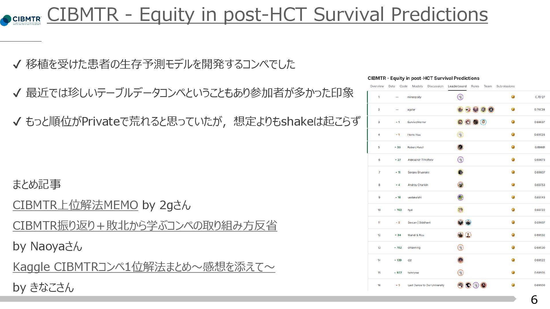 6. 6 CIBMTR - Equity in post-HCT Survival Predictions ✔ 移植を受けた患者の生存予測モデルを開発するコンペでした