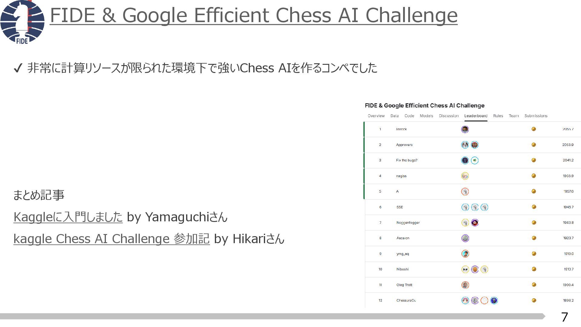 7. 7 FIDE & Google Efficient Chess AI Challenge ✔ 非常に計算リソースが限られた環境下で強いChess
