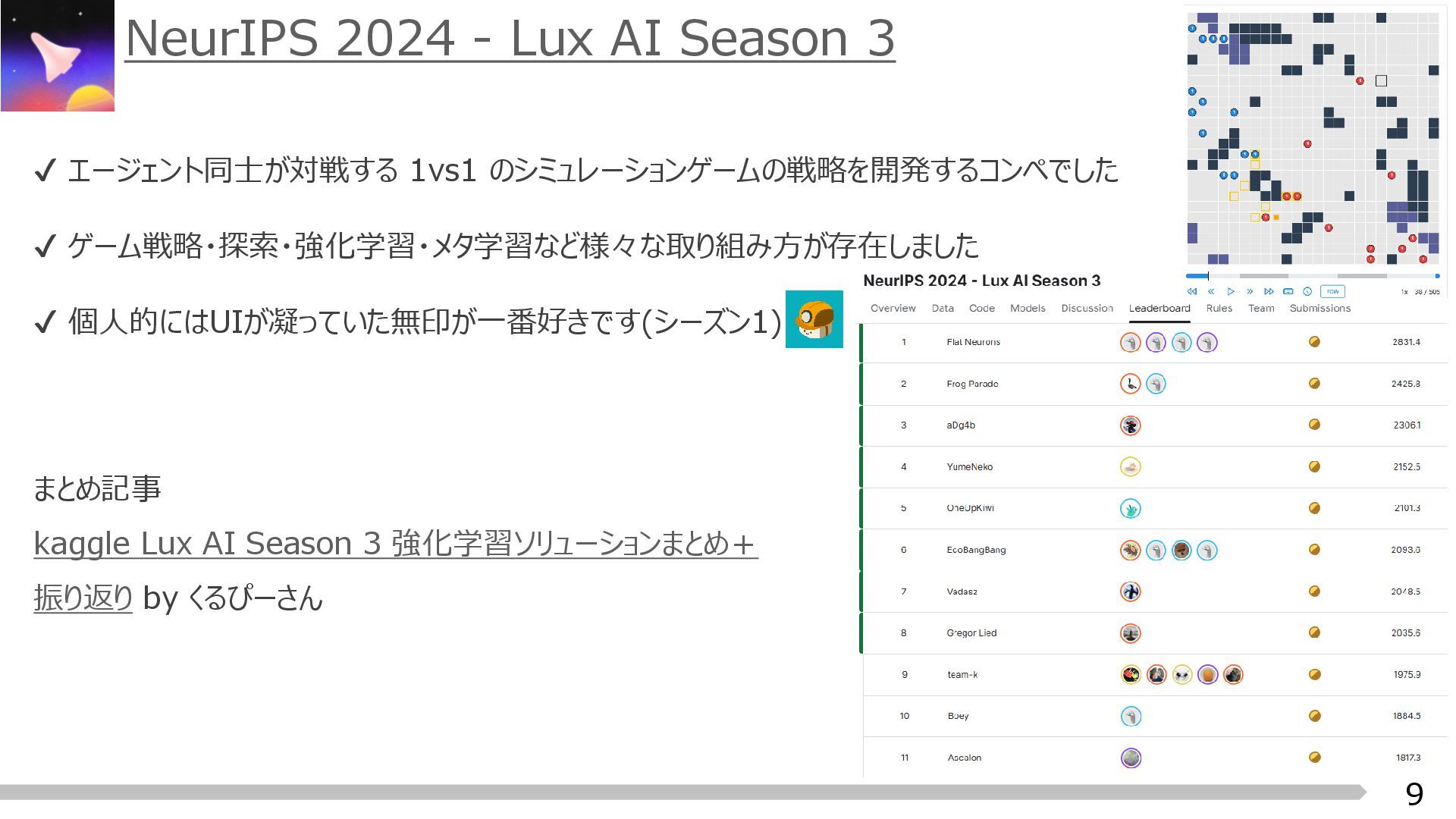 1vs1 のシミュレーションゲームの戦略を開発するコンペでした ✔ ゲーム戦略・探索・強化学習・メタ学習など様々な取り組み方が存在しました ✔ 個人的にはUIが凝っていた無印が一番好きです(シーズン1) まとめ記事 kaggle Lux AI Season 3 強化学習ソリューションまとめ+ 振り返り by くるぴーさん