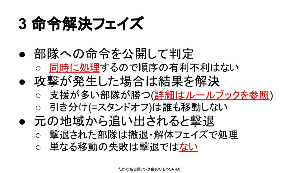 たに@名古屋フンタ会 [CC BY-SA 4.0] 3 命令解決フェイズ • 部隊への命令を公開して判定 ◦ 同時に処理するので順序の有利不利はない