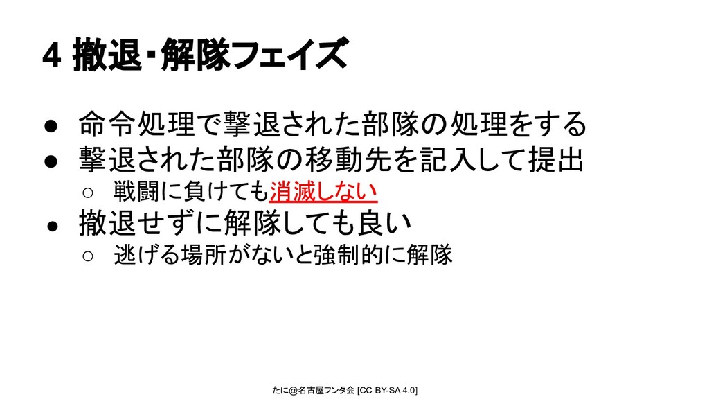 たに@名古屋フンタ会 [CC BY-SA 4.0] 4 撤退・解隊フェイズ • 命令処理で撃退された部隊の処理をする • 撃退された部隊の移動先を記入して提出