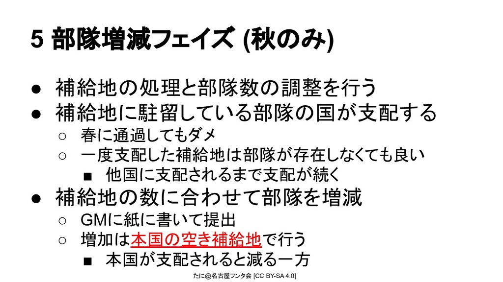 たに@名古屋フンタ会 [CC BY-SA 4.0] 5 部隊増減フェイズ (秋のみ) • 補給地の処理と部隊数の調整を行う •