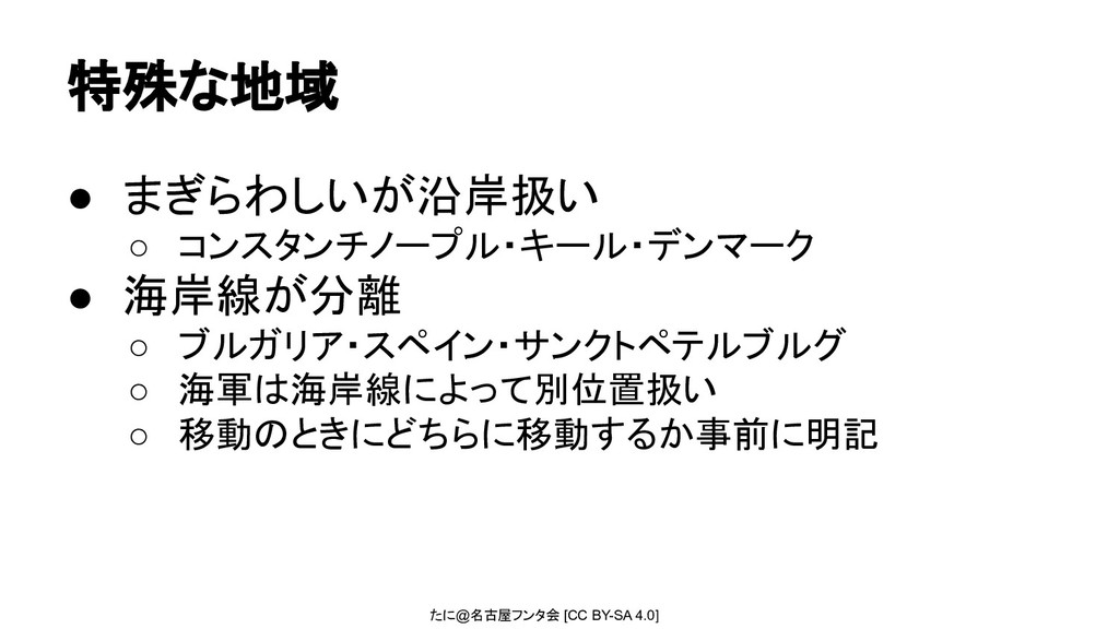 たに@名古屋フンタ会 [CC BY-SA 4.0] 行軍の注意 • 海軍の移動の補足 ◦ 沿岸地域同士は海岸線が繋がっていること ▪