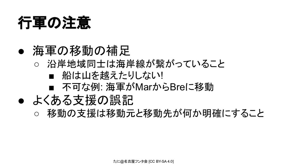 船は山を越えたりしない! ▪ 不可な例: 海軍がMarからBreに移動 • よくある支援の誤記 ◦ 移動の支援は移動元と移動先が何か明確にすること