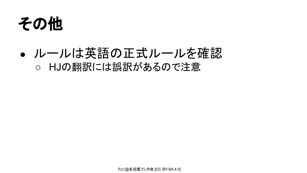 たに@名古屋フンタ会 [CC BY-SA 4.0] その他 • ルールは英語の正式ルールを確認 ◦ HJの翻訳には誤訳があるので注意