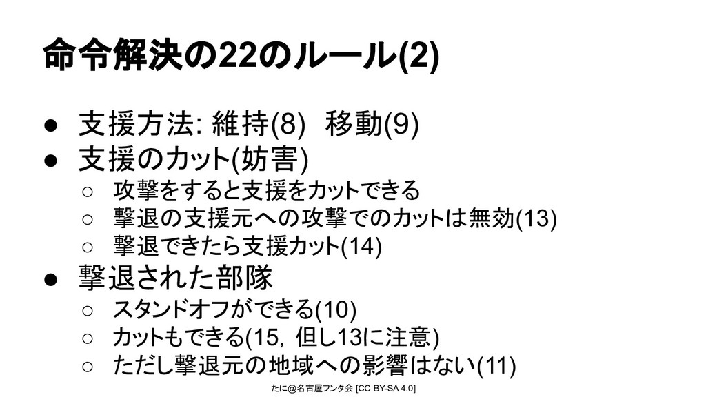 たに@名古屋フンタ会 [CC BY-SA 4.0] 命令解決の22のルール(1) • 基本原則 ◦ 同一戦力(1) ◦