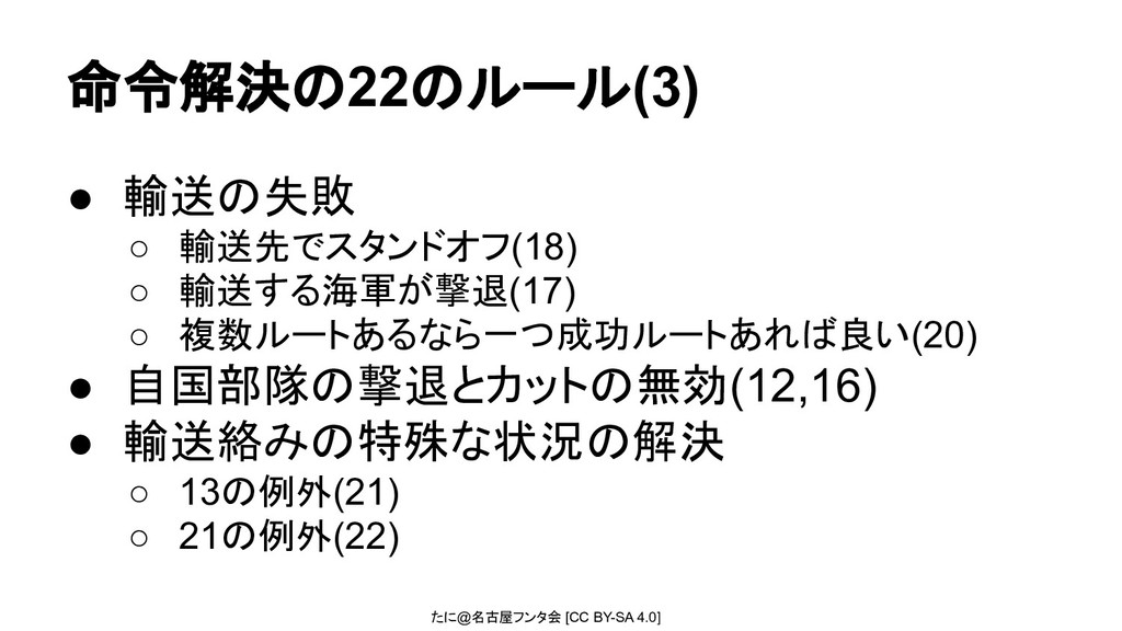たに@名古屋フンタ会 [CC BY-SA 4.0] 命令解決の22のルール(3) • 輸送の失敗 ◦ 輸送先でスタンドオフ(18) ◦