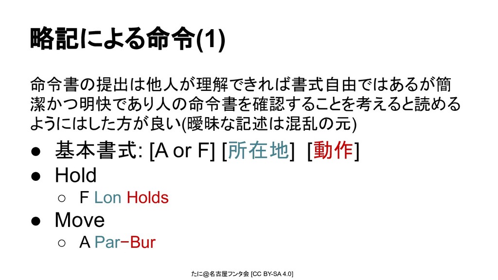 たに@名古屋フンタ会 [CC BY-SA 4.0] 略記による命令(1) 命令書の提出は他人が理解できれば書式自由ではあるが簡 潔かつ明快であり人の命令書を確認することを考えると読める ようにはした方が良い(曖昧な記述は混乱の元) • 基本書式: