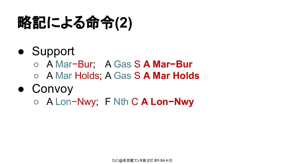 ◦ 書式自由(他人が明確に理解できるように!) • 行動は4種類 a. 維持(Hold) b. 移動(Move) c. 支援(Support) d. 輸送(Convoy)