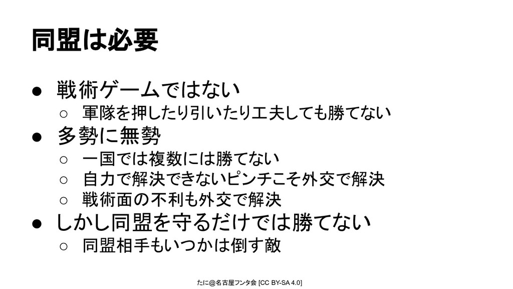 ◦ 一国では複数には勝てない ◦ 自力で解決できないピンチこそ外交で解決 ◦ 戦術面の不利も外交で解決 • しかし同盟を守るだけでは勝てない ◦ 同盟相手もいつかは倒す敵 同盟は必要
