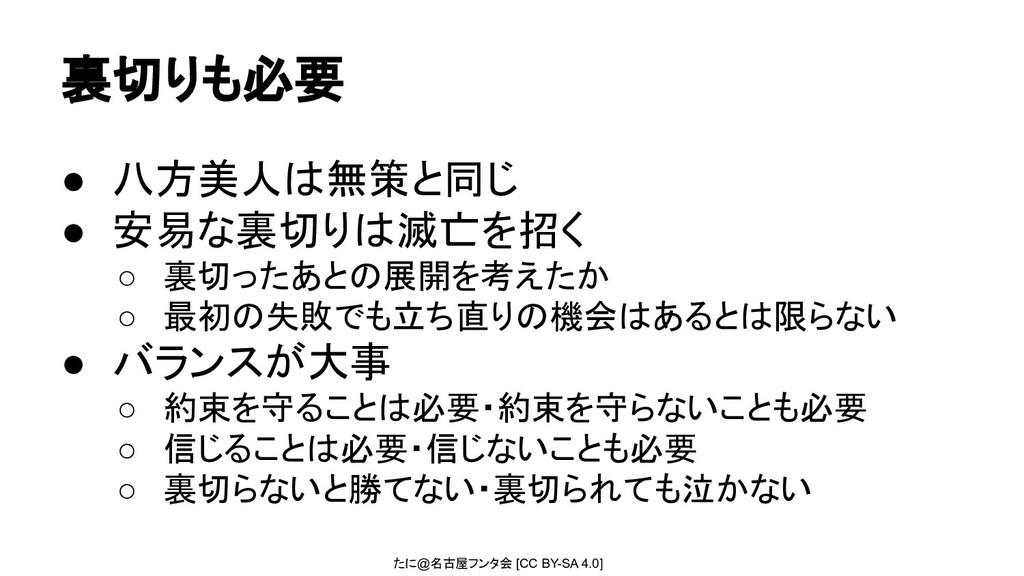 裏切ったあとの展開を考えたか ◦ 最初の失敗でも立ち直りの機会はあるとは限らない • バランスが大事 ◦ 約束を守ることは必要・約束を守らないことも必要 ◦ 信じることは必要・信じないことも必要 ◦ 裏切らないと勝てない・裏切られても泣かない