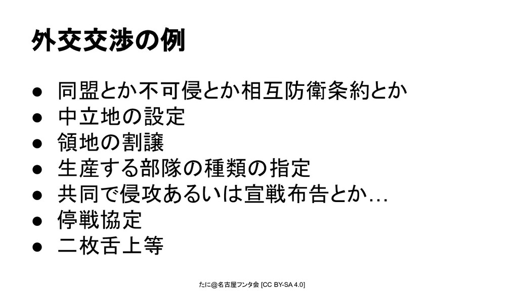 たに@名古屋フンタ会 [CC BY-SA 4.0] 外交交渉の例 • 同盟とか不可侵とか相互防衛条約とか • 中立地の設定 •