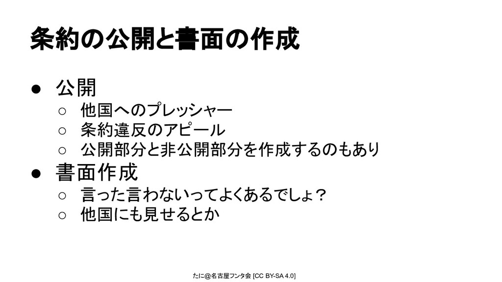 たに@名古屋フンタ会 [CC BY-SA 4.0] 条約の公開と書面の作成 • 公開 ◦ 他国へのプレッシャー ◦