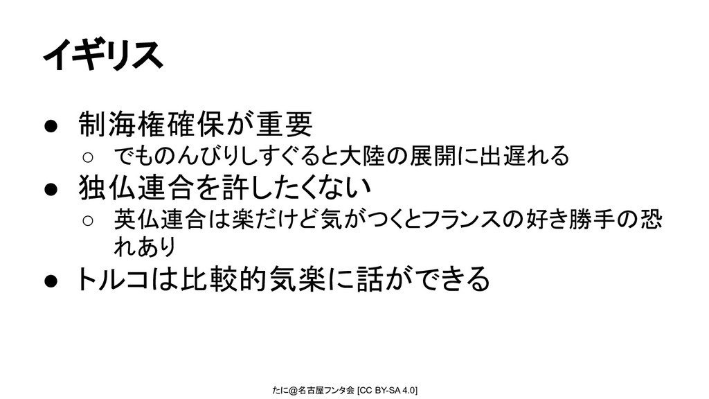 たに@名古屋フンタ会 [CC BY-SA 4.0] イギリス • 制海権確保が重要 ◦ でものんびりしすぐると大陸の展開に出遅れる •