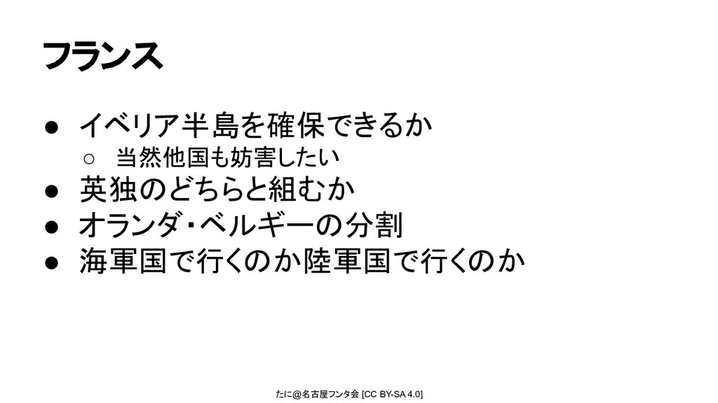 たに@名古屋フンタ会 [CC BY-SA 4.0] フランス • イベリア半島を確保できるか ◦ 当然他国も妨害したい •