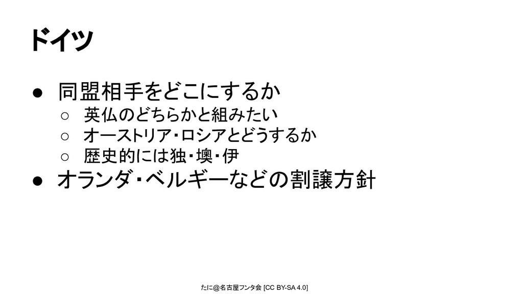 たに@名古屋フンタ会 [CC BY-SA 4.0] ドイツ • 同盟相手をどこにするか ◦ 英仏のどちらかと組みたい ◦