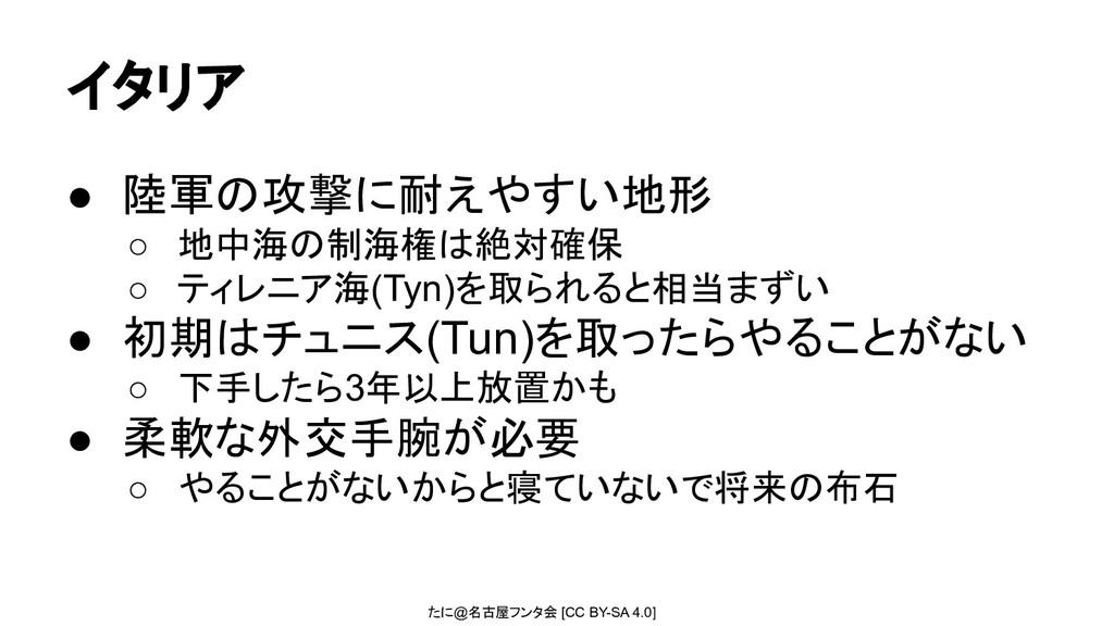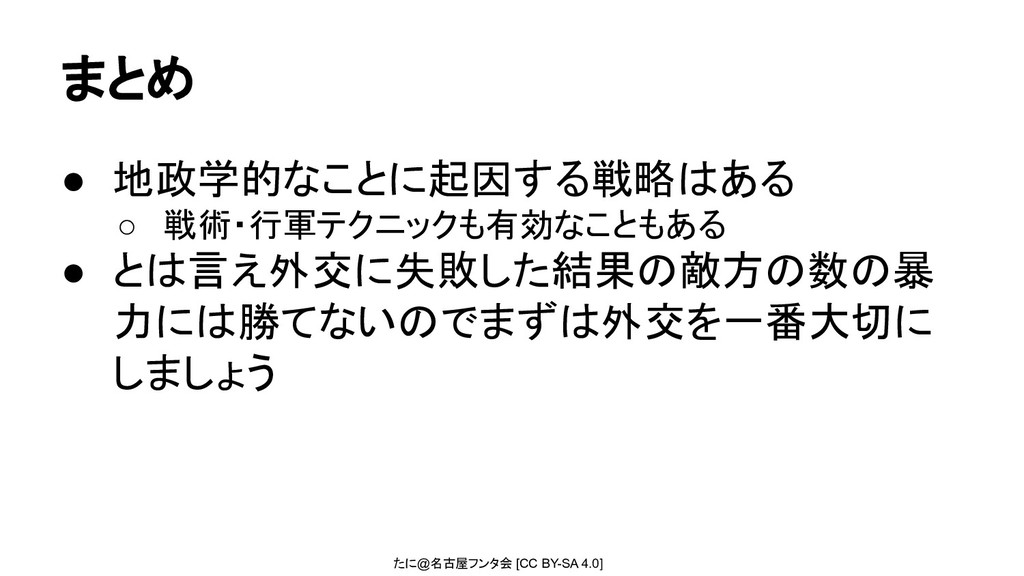 たに@名古屋フンタ会 [CC BY-SA 4.0] まとめ • 地政学的なことに起因する戦略はある ◦ 戦術・行軍テクニックも有効なこともある •
