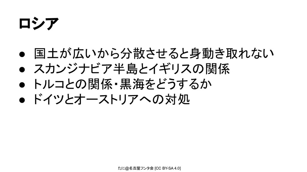 たに@名古屋フンタ会 [CC BY-SA 4.0] ロシア • 国土が広いから分散させると身動き取れない • スカンジナビア半島とイギリスの関係 •