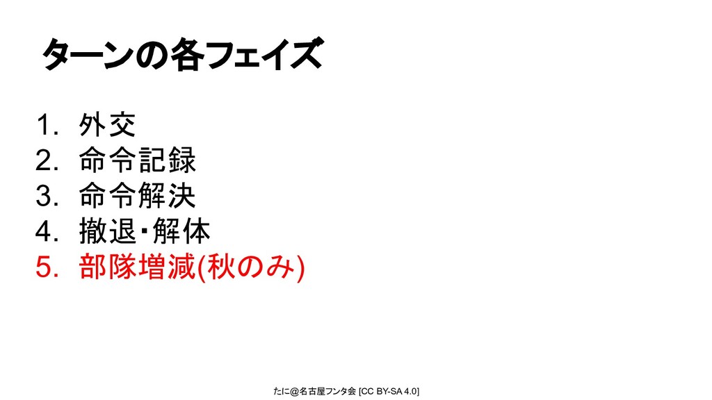 たに@名古屋フンタ会 [CC BY-SA 4.0] ターンの各フェイズ 1. 外交 2. 命令記録 3.
