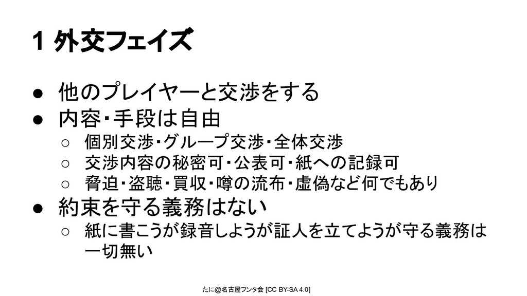 たに@名古屋フンタ会 [CC BY-SA 4.0] 1 外交フェイズ • 他のプレイヤーと交渉をする • 内容・手段は自由