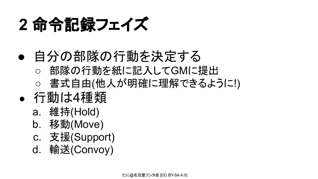 たに@名古屋フンタ会 [CC BY-SA 4.0] 2 命令記録フェイズ • 自分の部隊の行動を決定する ◦ 部隊の行動を紙に記入してGMに提出