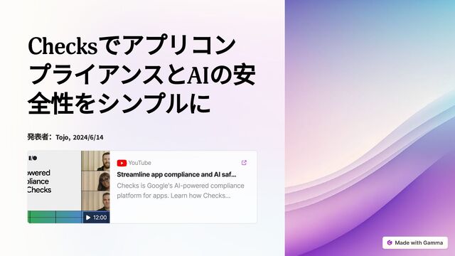 Checks でアプリコン プライアンスとAI の安 全性をシンプルに 発表者:Tojo, 2024/6/14 12:00 YouTube Streamline