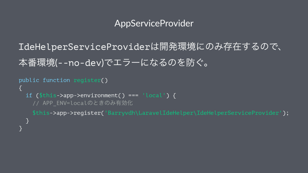 AppServiceProvider IdeHelperServiceProvider։ൃڥʹͷΈଘࡏ͢ΔͷͰɺ ຊ൪ڥ(--no-dev)ͰΤϥʔʹͳΔͷΛ͙ɻ public function register() { if ($this->app->environment() ===