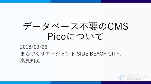 特定非営利活動法人 まちづくりエージェント SIDE BEACH CITY. データベース不要のCMS Picoについて 2018/09/26 まちづくりエージェント SIDE
