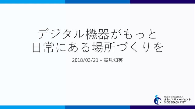 特定非営利活動法人 まちづくりエージェント SIDE BEACH CITY. デジタル機器がもっと 日常にある場所づくりを 2018/03/21 - 高見知英