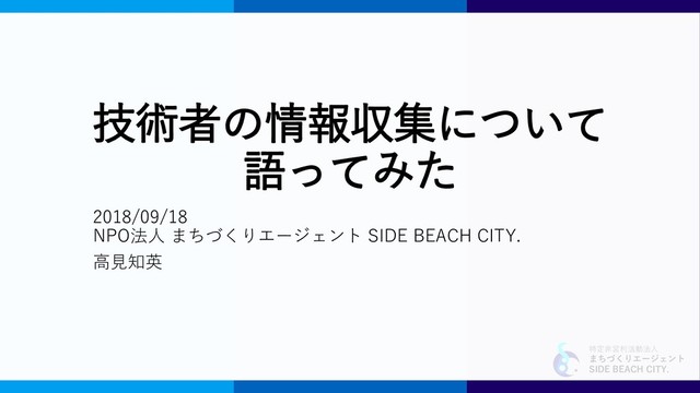 特定非営利活動法人 まちづくりエージェント SIDE BEACH CITY. 技術者の情報収集について 語ってみた 2018/09/18 NPO法人 まちづくりエージェント