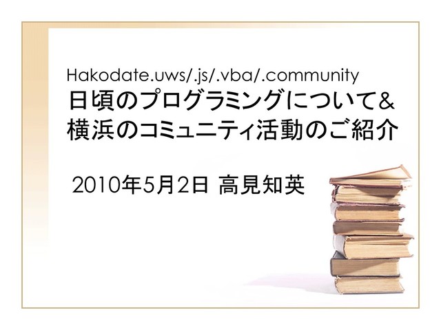 Hakodate.uws/.js/.vba/.community 日頃のプログラミングについて& 横浜のコミュニティ活動のご紹介 2010年5月2日 高見知英