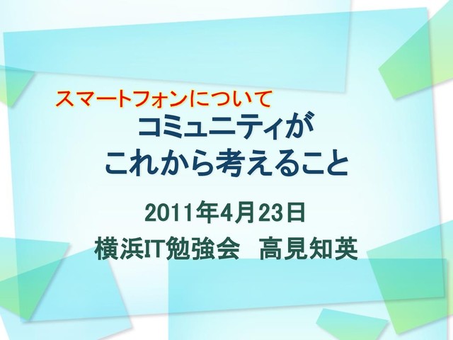 参画者募集中 スマートフォン懇親会 いままでにない場所でも開催を 横浜IT勉強会 講師・スタッフ 横浜ソーシャル 開発者とかネタ出しとか 2011/04/23 スマートフォンについてコミュニティ がこれから考えること