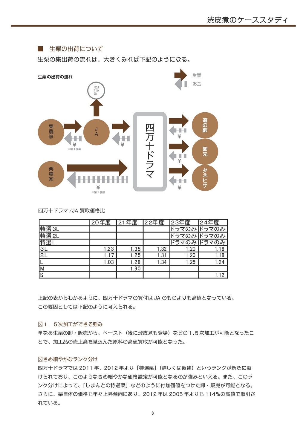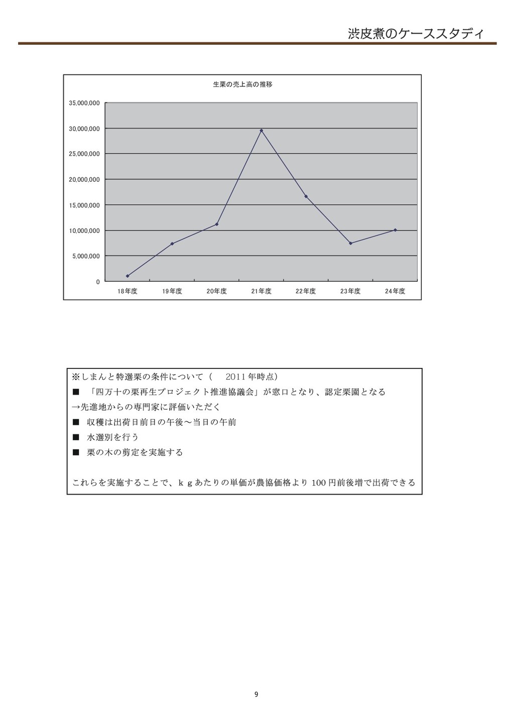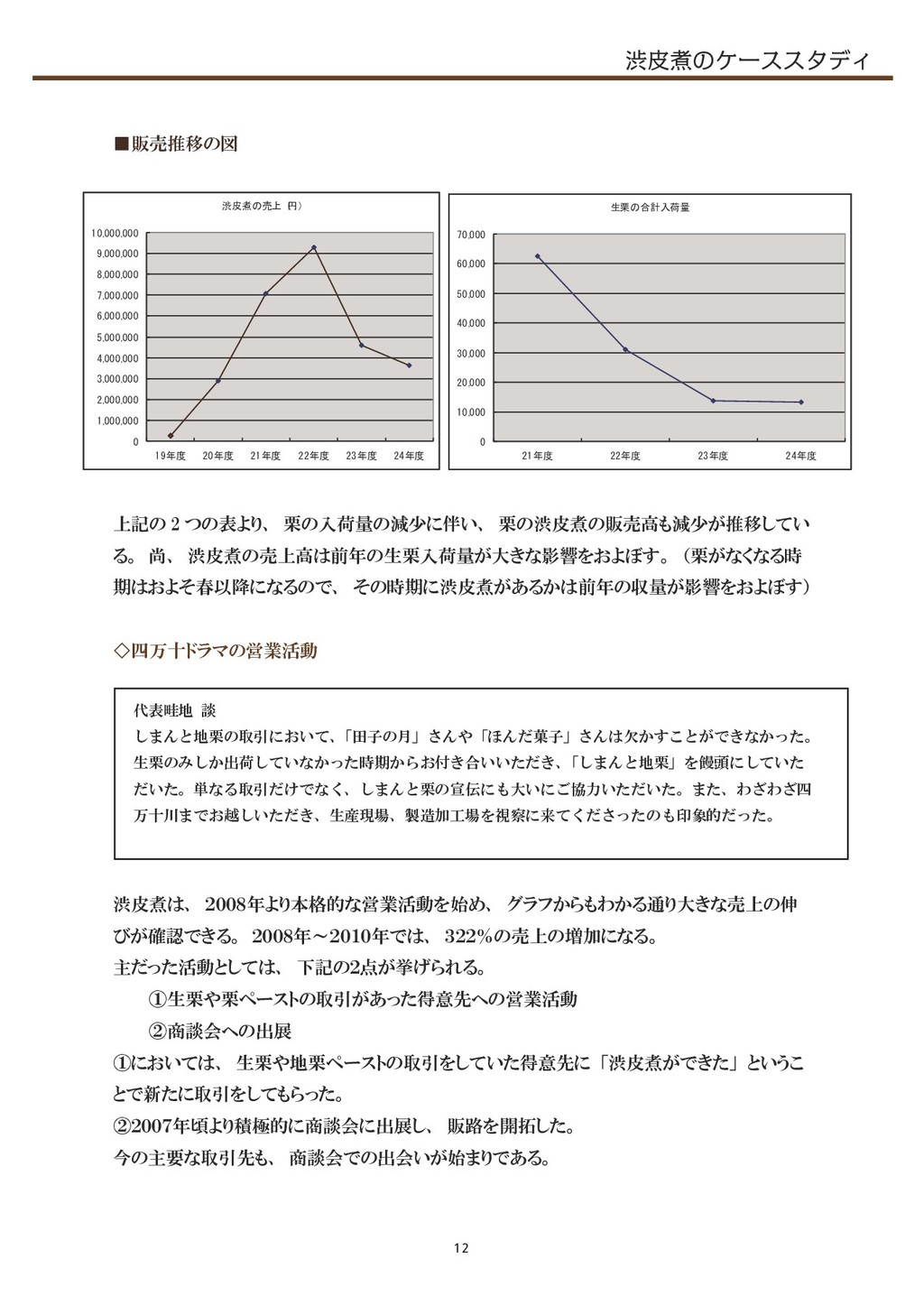 (栗がなくなる時 期はおよそ春以降になるので、 その時期に渋皮煮があるかは前年の収量が影響をおよぼす) ◇四万十ドラマの営業活動 渋皮煮は、 2008年より本格的な営業活動を始め、 グラフからもわかる通り大きな売上の伸 びが確認できる。 2008年~2010年では、 322%の売上の増加になる。 主だった活動としては、 下記の2点が挙げられる。    ① 生栗や栗ペーストの取引があった得意先への営業活動    ② 商談会への出展 ①においては、 生栗や地栗ペーストの取引をしていた得意先に 「渋皮煮ができた」 というこ とで新たに取引をしてもらった。 ②2007年頃より積極的に商談会に出展し、 販路を開拓した。 今の主要な取引先も、 商談会での出会いが始まりである。 渋皮煮の売上( 円) 0 1, 000, 000 2, 000, 000 3, 000, 000 4, 000, 000 5, 000, 000 6, 000, 000 7, 000, 000 8, 000, 000 9, 000, 000 10, 000, 000 19年度 20年度 21年度 22年度 23年度 24年度 生栗の合計入荷量 0 10, 000 20, 000 30, 000 40, 000 50, 000 60, 000 70, 000 21年度 22年度 23年度 24年度 代表畦地 談 しまんと地栗の取引において、 「田子の月」さんや「ほんだ菓子」さんは欠かすことができなかった。 生栗のみしか出荷していなかった時期からお付き合いいただき、 「しまんと地栗」を饅頭にしていた だいた。単なる取引だけでなく、しまんと栗の宣伝にも大いにご協力いただいた。また、わざわざ四 万十川までお越しいただき、生産現場、製造加工場を視察に来てくださったのも印象的だった。 12