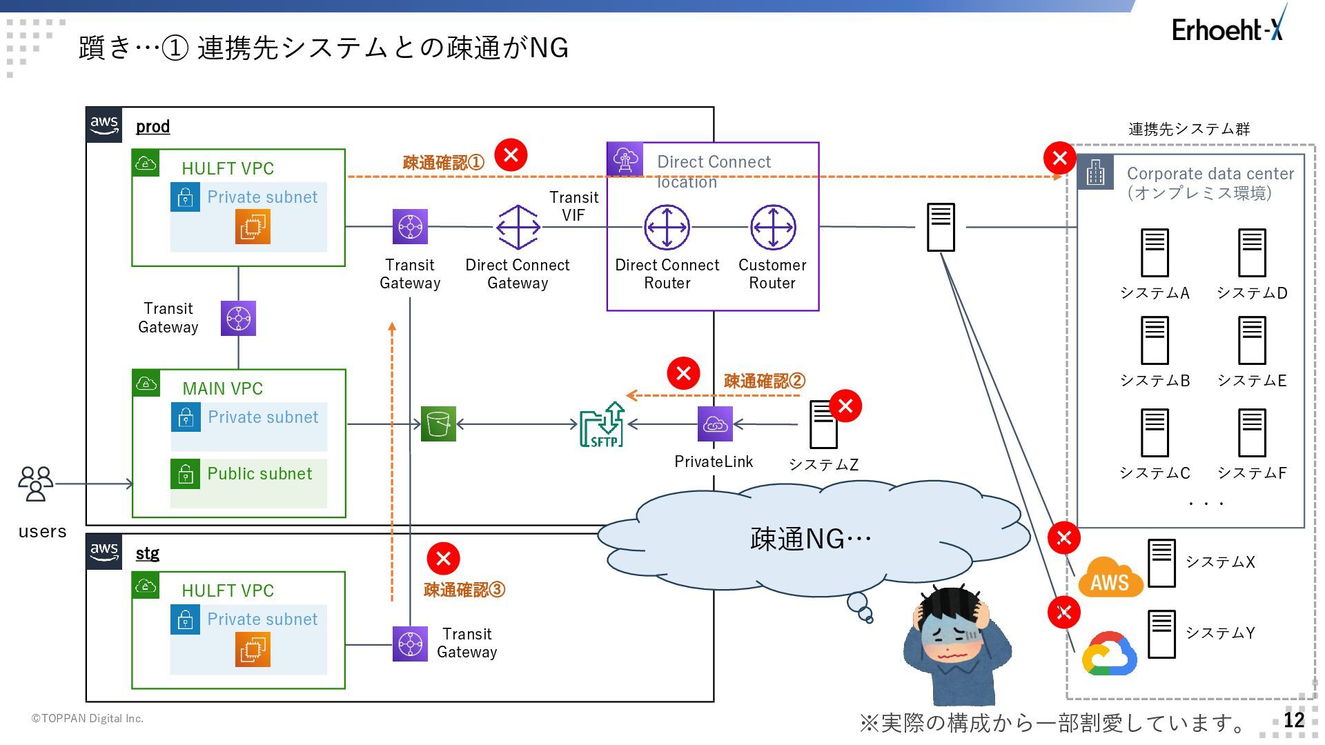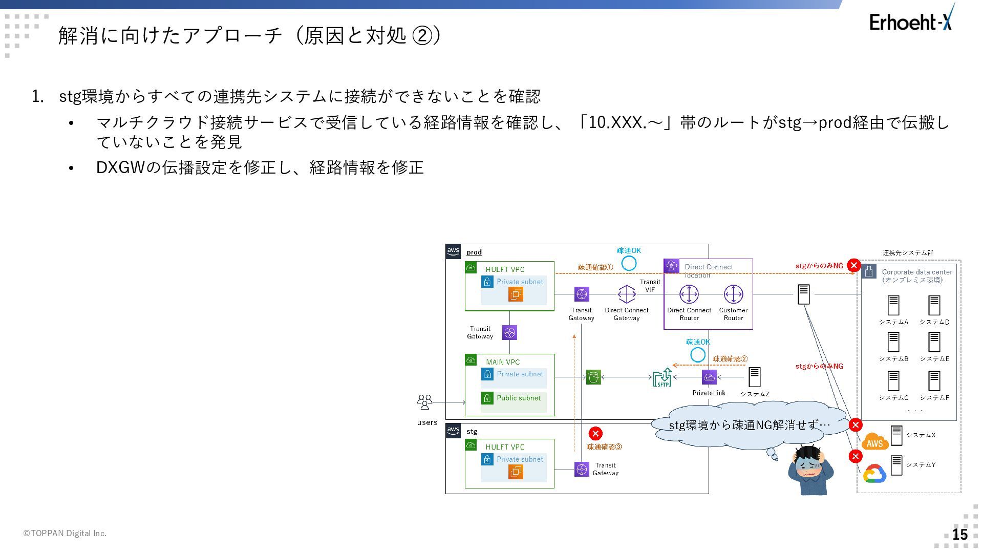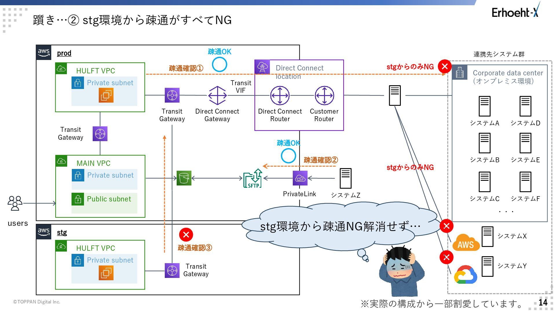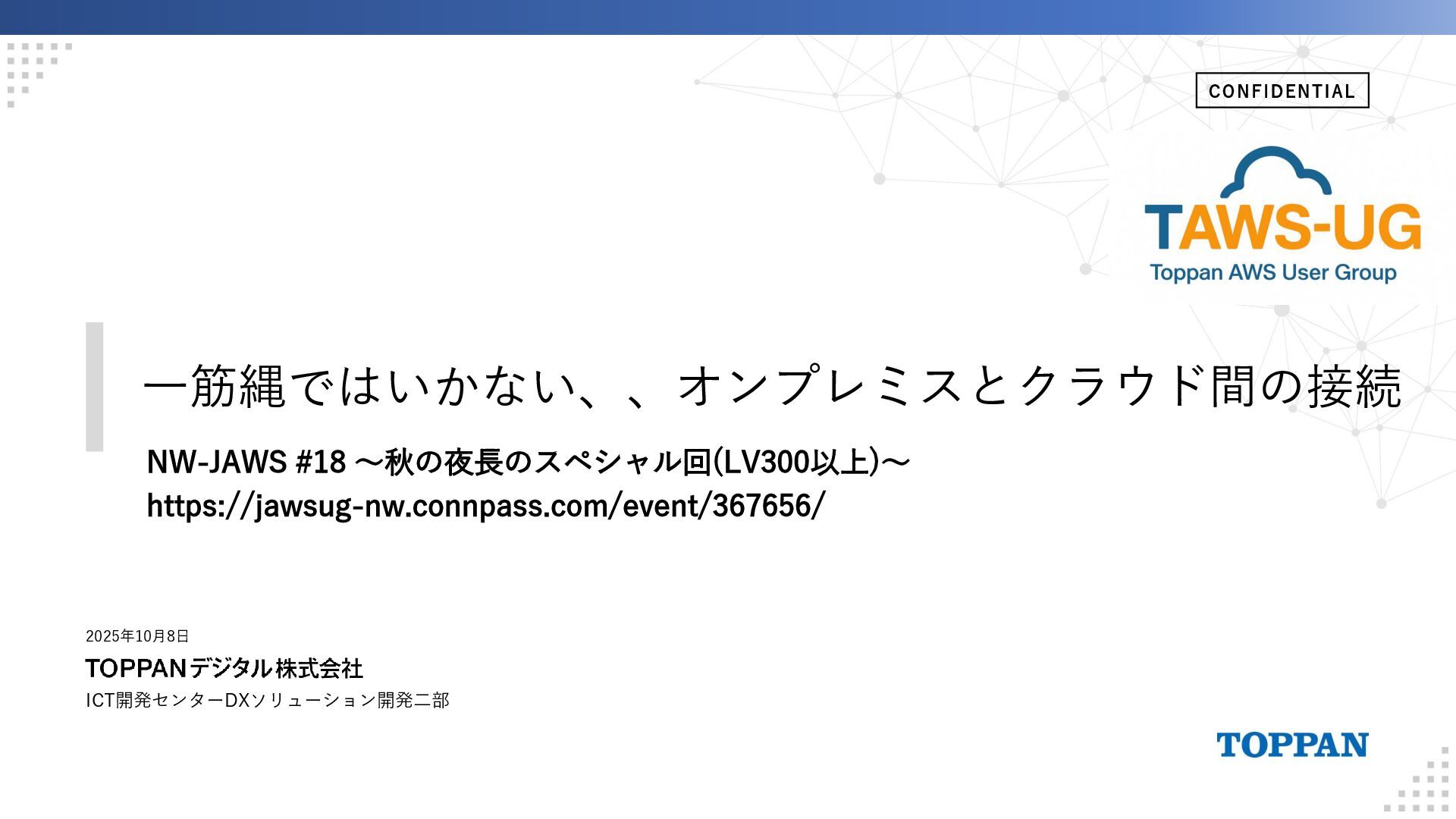 ■概要 オンプレミス環境とAWSクラウド環境(複数環境、Direct Connect、Transit Gateway、マルチクラウド接続など)を接続する際に発生した疎通トラブルの原因分析と、解決に至るまでのプロセス・学びを共有する技術事例