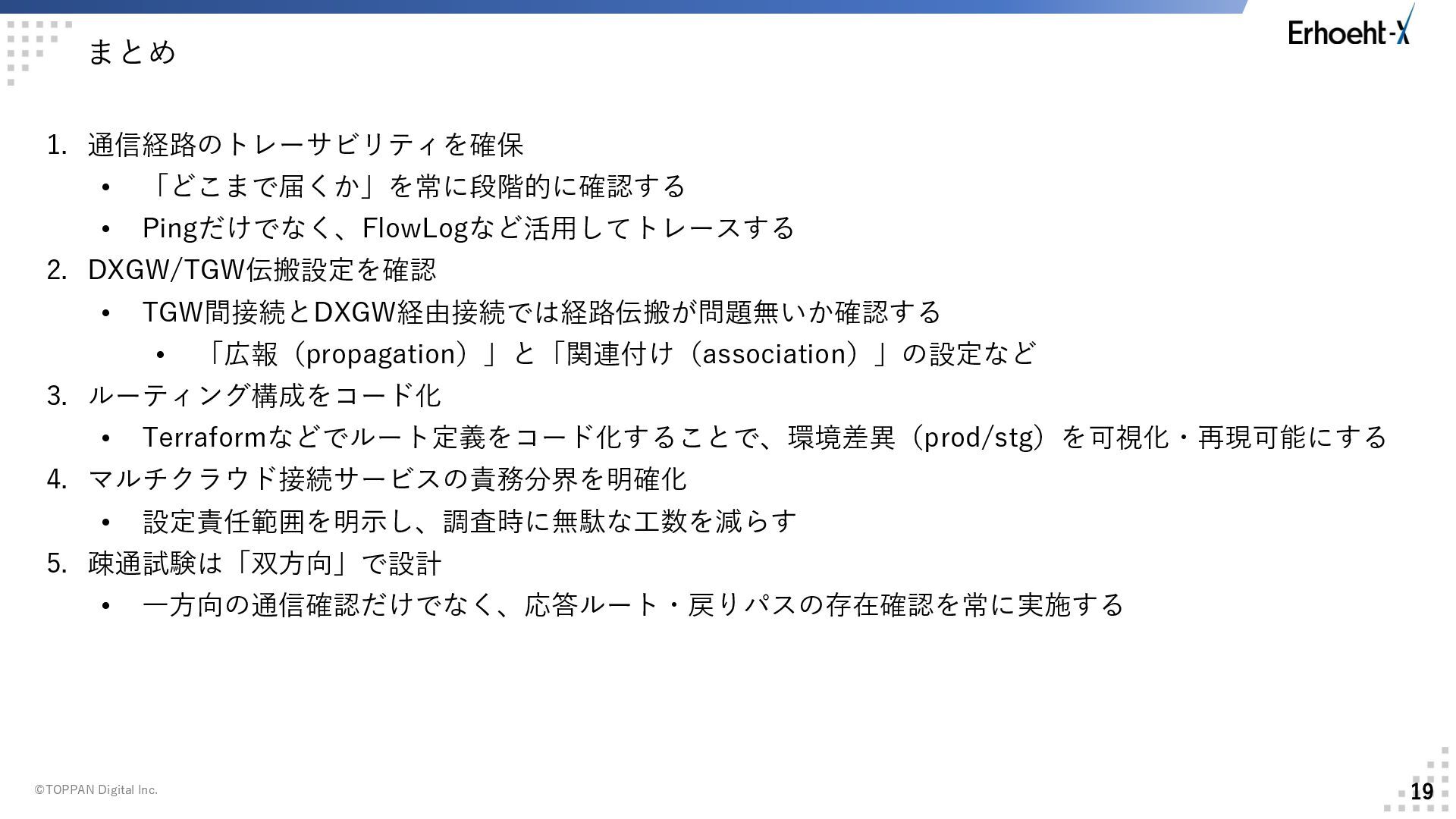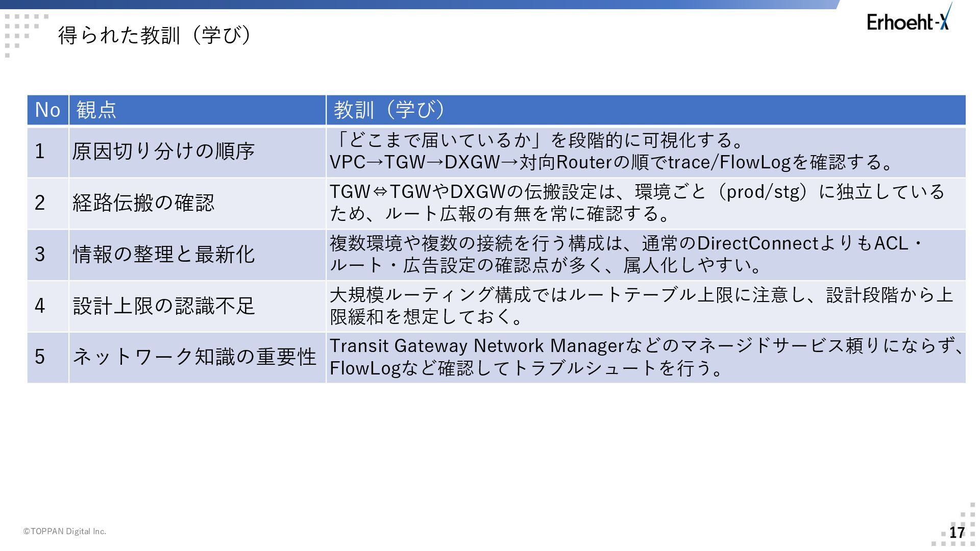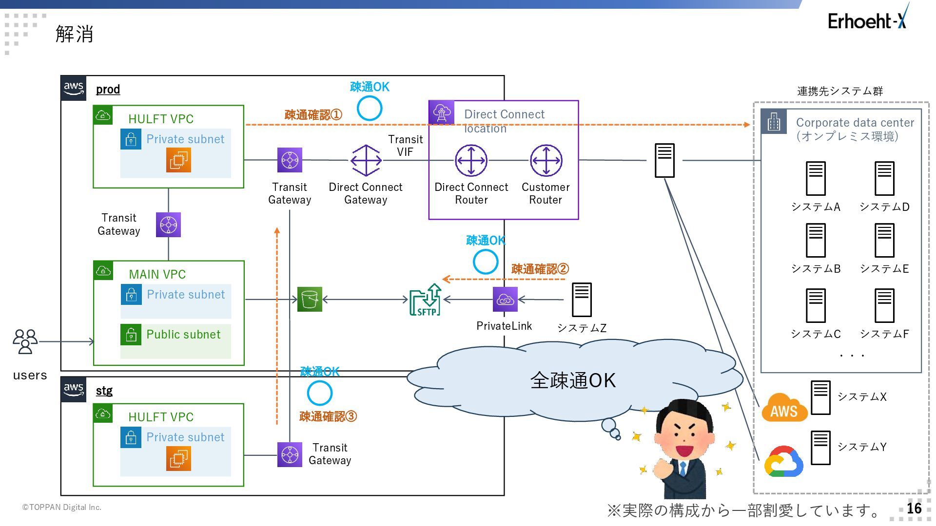 ■概要 オンプレミス環境とAWSクラウド環境(複数環境、Direct Connect、Transit Gateway、マルチクラウド接続など)を接続する際に発生した疎通トラブルの原因分析と、解決に至るまでのプロセス・学びを共有する技術事例