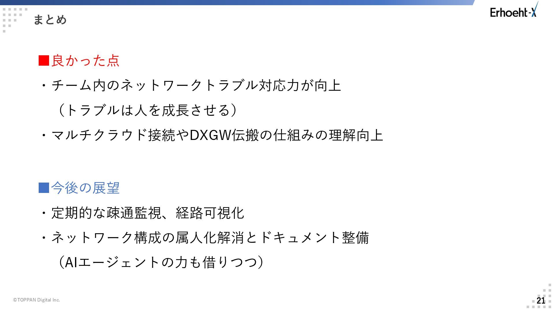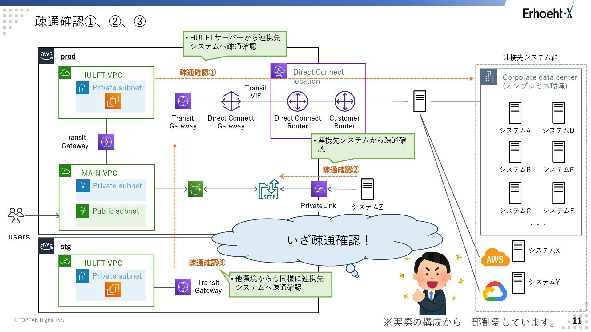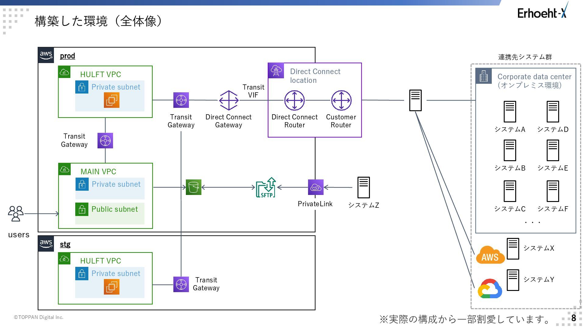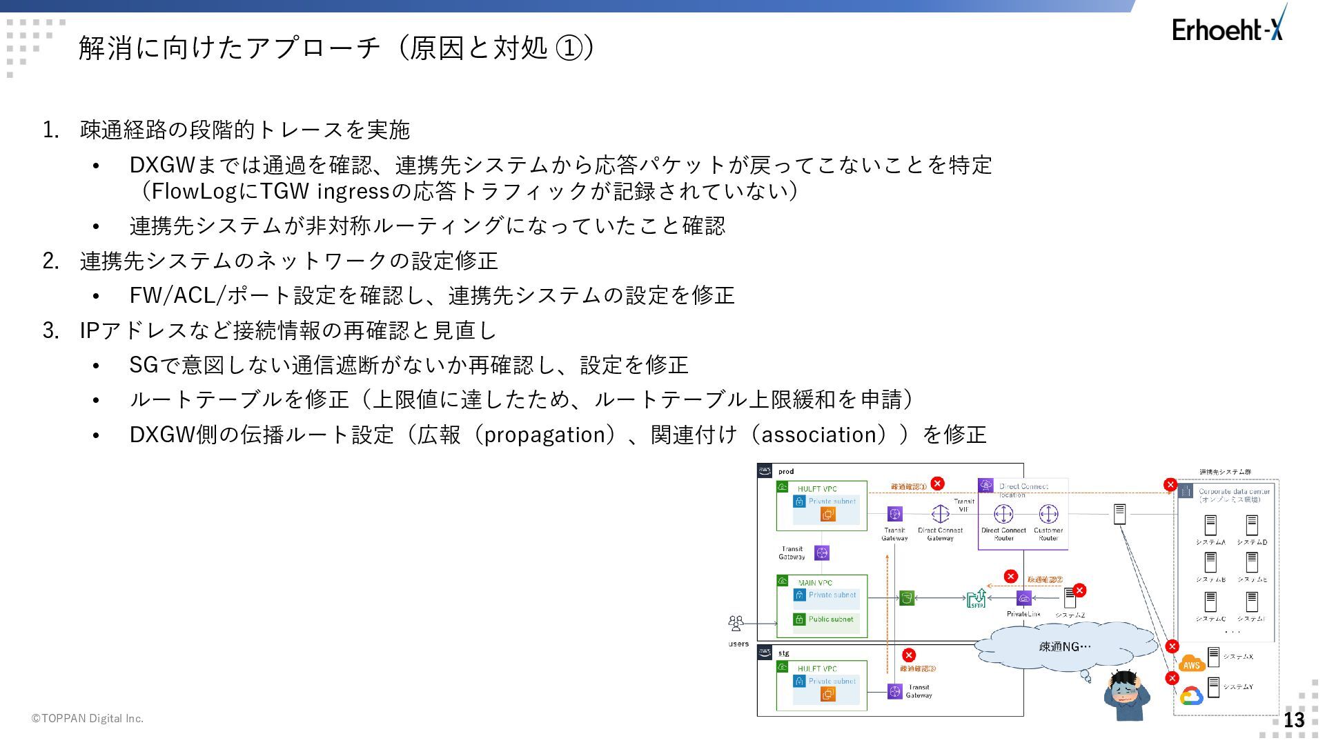 ■概要 オンプレミス環境とAWSクラウド環境(複数環境、Direct Connect、Transit Gateway、マルチクラウド接続など)を接続する際に発生した疎通トラブルの原因分析と、解決に至るまでのプロセス・学びを共有する技術事例
