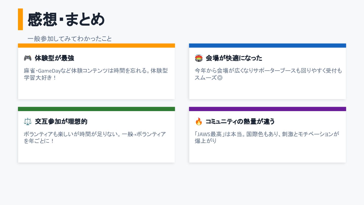 ⚖ 交互参加が理想的 ボランティアも楽しいが時間が足りない。一般 ↔ボランティア を年ごとに! 🔥 コミュニティの熱量が違う 「JAWS最高」は本当。国際色もあり、刺激とモチベーションが 爆上がり