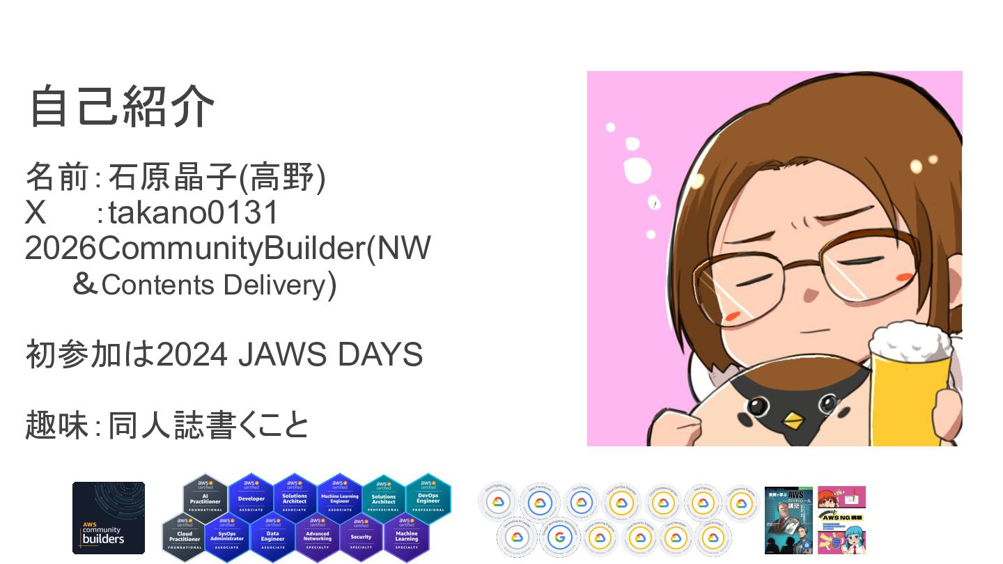 自己紹介 名前:石原晶子(高野) X :takano0131 2026CommunityBuilder(NW &Contents Delivery) 初参加は2024 JAWS DAYS