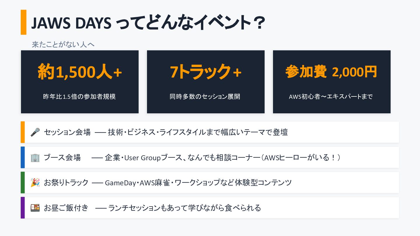 AWS初心者〜エキスパートまで 🎤 セッション会場 ── 技術・ビジネス・ライフスタイルまで幅広いテーマで登壇 🏢 ブース会場 ── 企業・User Groupブース、なんでも相談コーナー(AWSヒーローがいる!) 🎉 お祭りトラック ── GameDay・AWS麻雀・ワークショップなど体験型コンテンツ 🍱 お昼ご飯付き ── ランチセッションもあって学びながら食べられる