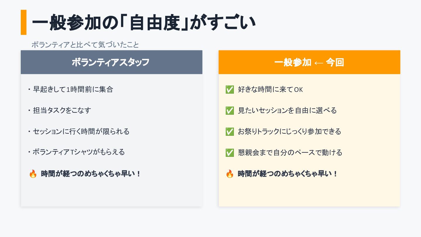 ボランティアTシャツがもらえる 一般参加 ← 今回 ✅ 好きな時間に来て OK ✅ 見たいセッションを自由に選べる ✅ お祭りトラックにじっくり参加できる ✅ 懇親会まで自分のペースで動ける 🔥 時間が経つのめちゃくちゃ早い! 🔥 時間が経つのめちゃくちゃ早い!