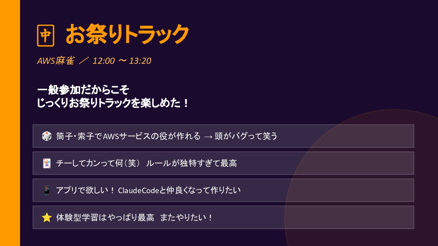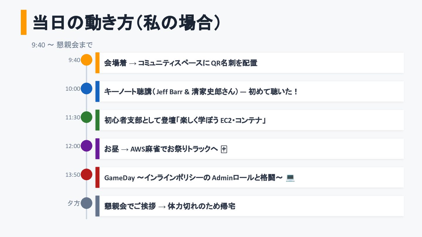 キーノート聴講(Jeff Barr & 清家史郎さん)— 初めて聴いた! 11:30 初心者支部として登壇「楽しく学ぼう EC2・コンテナ」 12:00 お昼 → AWS麻雀でお祭りトラックへ 🀄 13:50 GameDay 〜インラインポリシーの Adminロールと格闘〜 💻 夕方 懇親会でご挨拶 → 体力切れのため帰宅