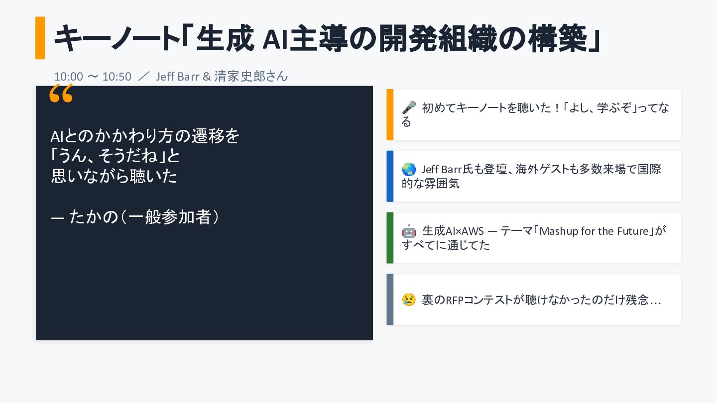“ AIとのかかわり方の遷移を 「うん、そうだね」と 思いながら聴いた — たかの(一般参加者) 🎤 初めてキーノートを聴いた!「よし、学ぶぞ」ってな る 🌏 Jeff Barr氏も登壇、海外ゲストも多数来場で国際 的な雰囲気 🤖 生成AI×AWS — テーマ「Mashup for the Future」が すべてに通じてた 😢 裏のRFPコンテストが聴けなかったのだけ残念…