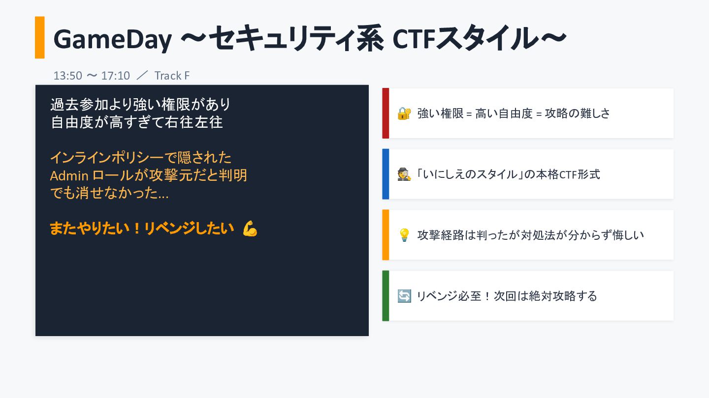 自由度が高すぎて右往左往 インラインポリシーで隠された Admin ロールが攻撃元だと判明 でも消せなかった... またやりたい!リベンジしたい 💪 🔐 強い権限 = 高い自由度 = 攻略の難しさ 🕵 「いにしえのスタイル」の本格CTF形式 💡 攻撃経路は判ったが対処法が分からず悔しい 🔄 リベンジ必至!次回は絶対攻略する