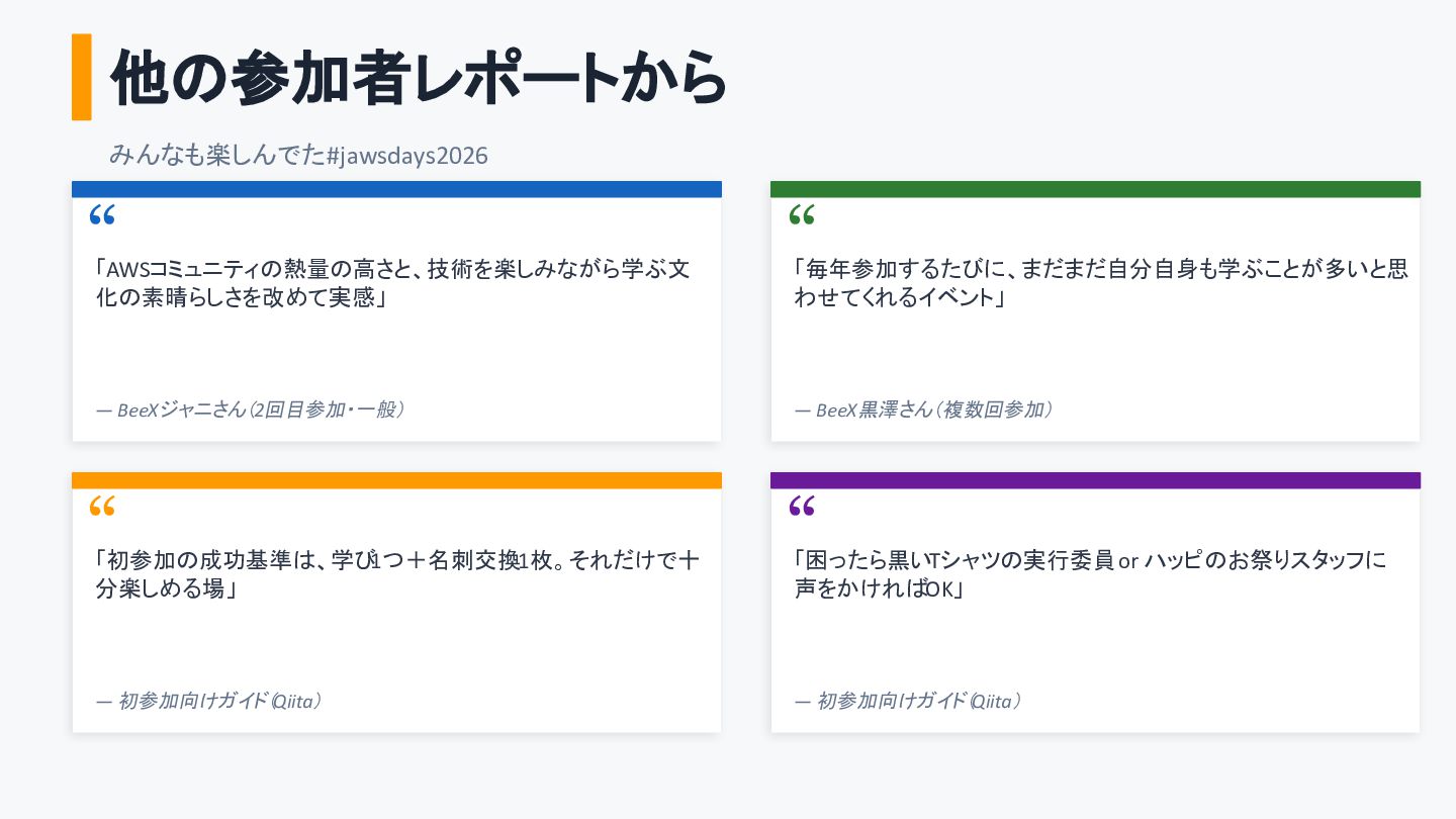 他の参加者レポートから みんなも楽しんでた #jawsdays2026 “ 「AWSコミュニティの熱量の高さと、技術を楽しみながら学ぶ文 化の素晴らしさを改めて実感」 — BeeXジャニさん(2回目参加・一般) “ 「毎年参加するたびに、まだまだ自分自身も学ぶことが多いと思