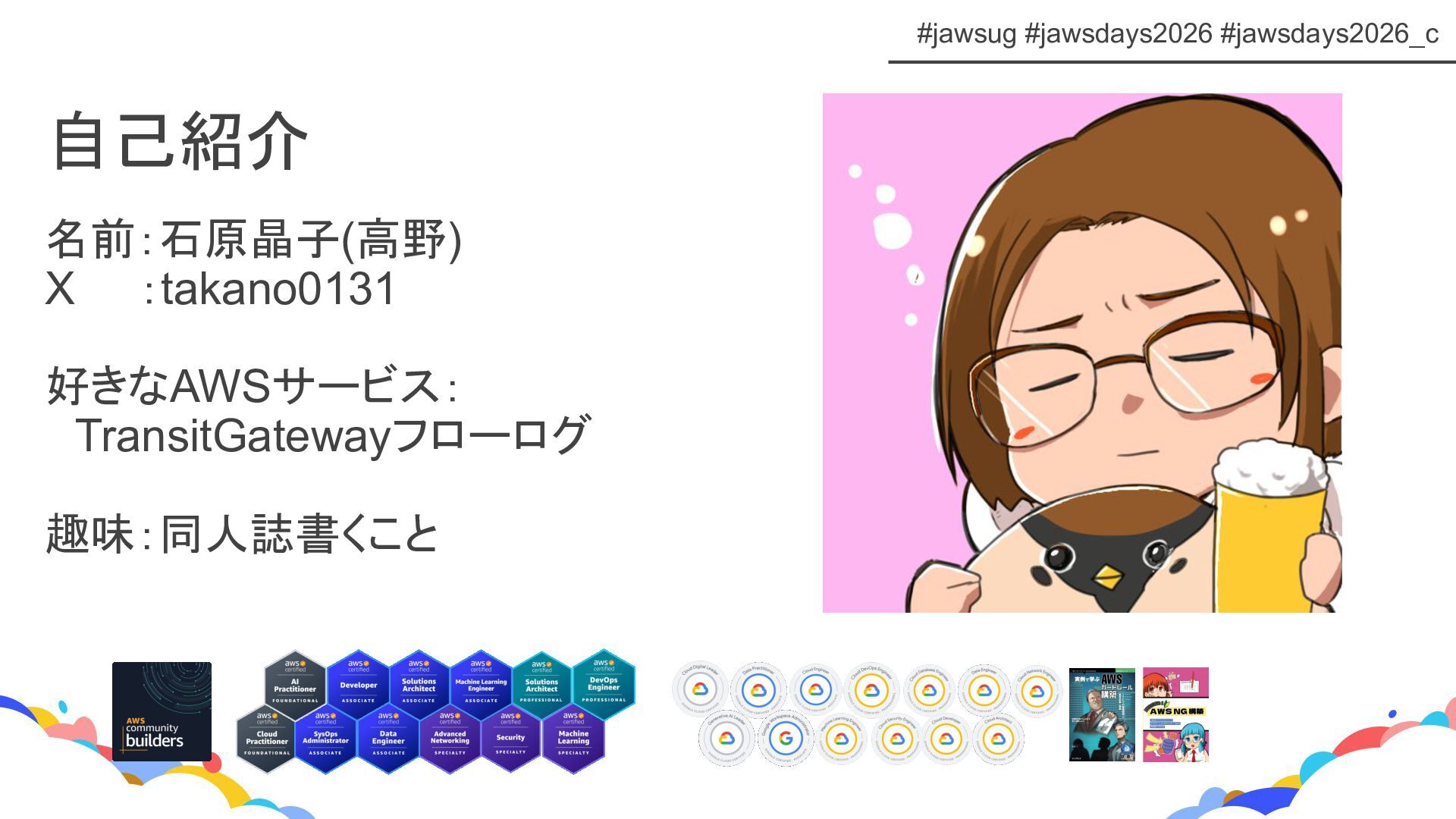 #jawsug #jawsdays2026 #jawsdays2026_c 自己紹介 名前:石原晶子(高野) X :takano0131 好きなAWSサービス: TransitGatewayフローログ 趣味:同人誌書くこと