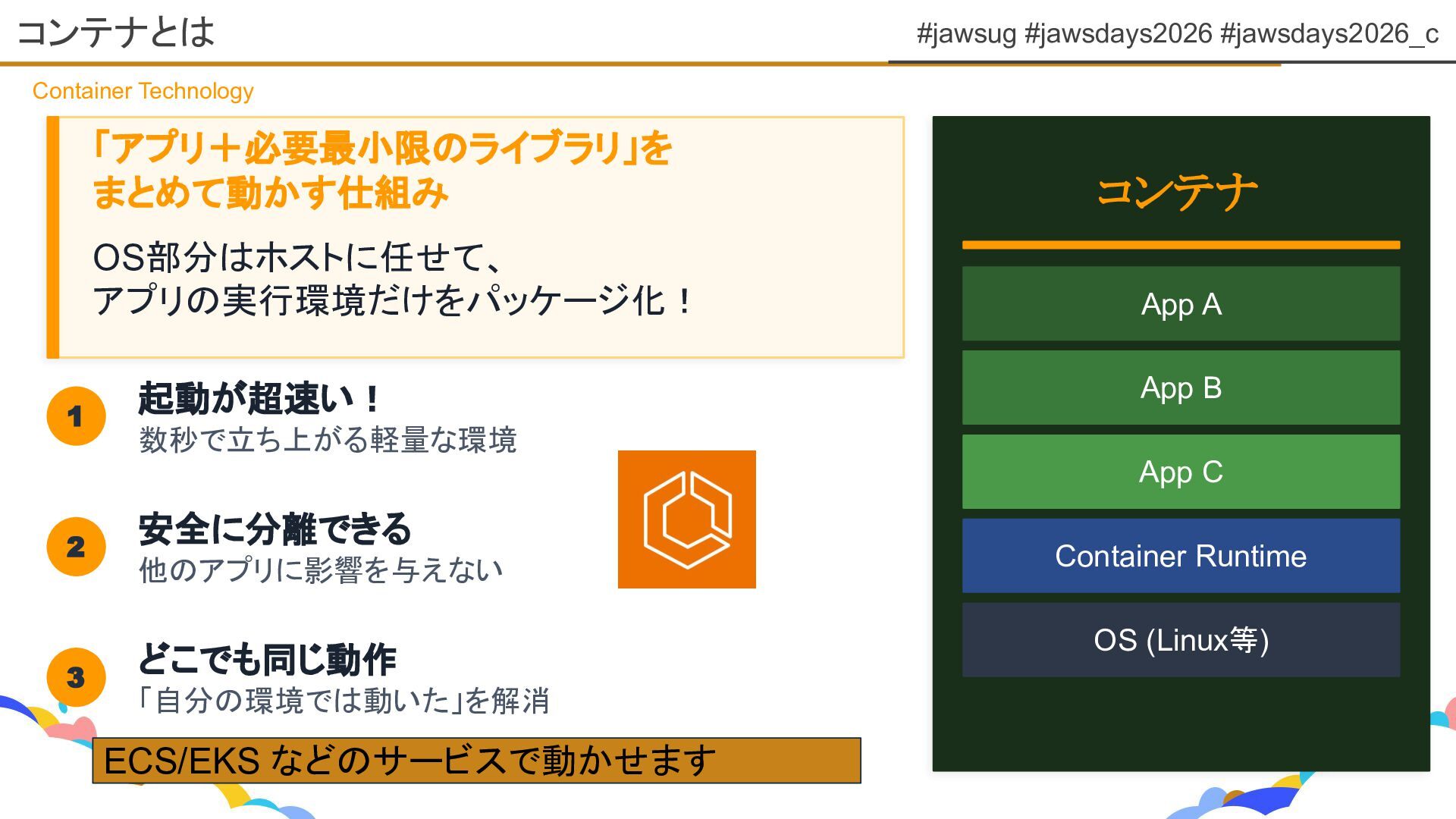 #jawsug #jawsdays2026 #jawsdays2026_c コンテナとは Container Technology 「アプリ+必要最小限のライブラリ」を まとめて動かす仕組み OS部分はホストに任せて、 アプリの実行環境だけをパッケージ化!