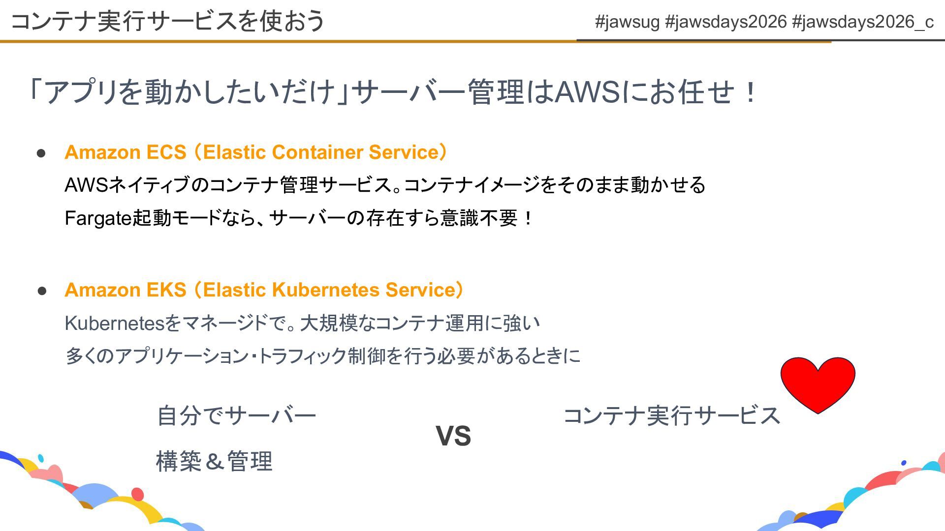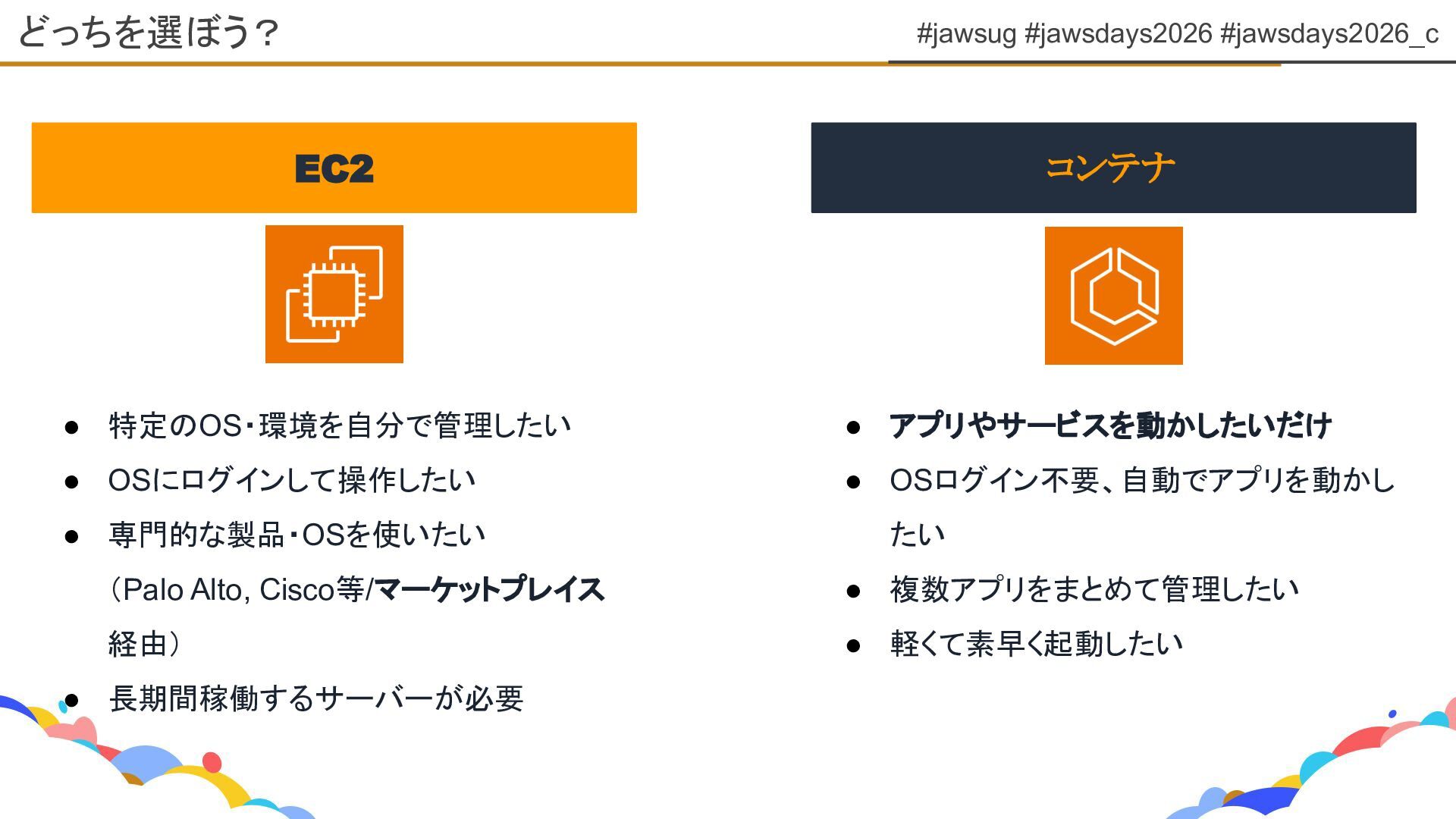 #jawsug #jawsdays2026 #jawsdays2026_c どっちを選ぼう? EC2 コンテナ • 特定のOS・環境を自分で管理したい • OSにログインして操作したい
