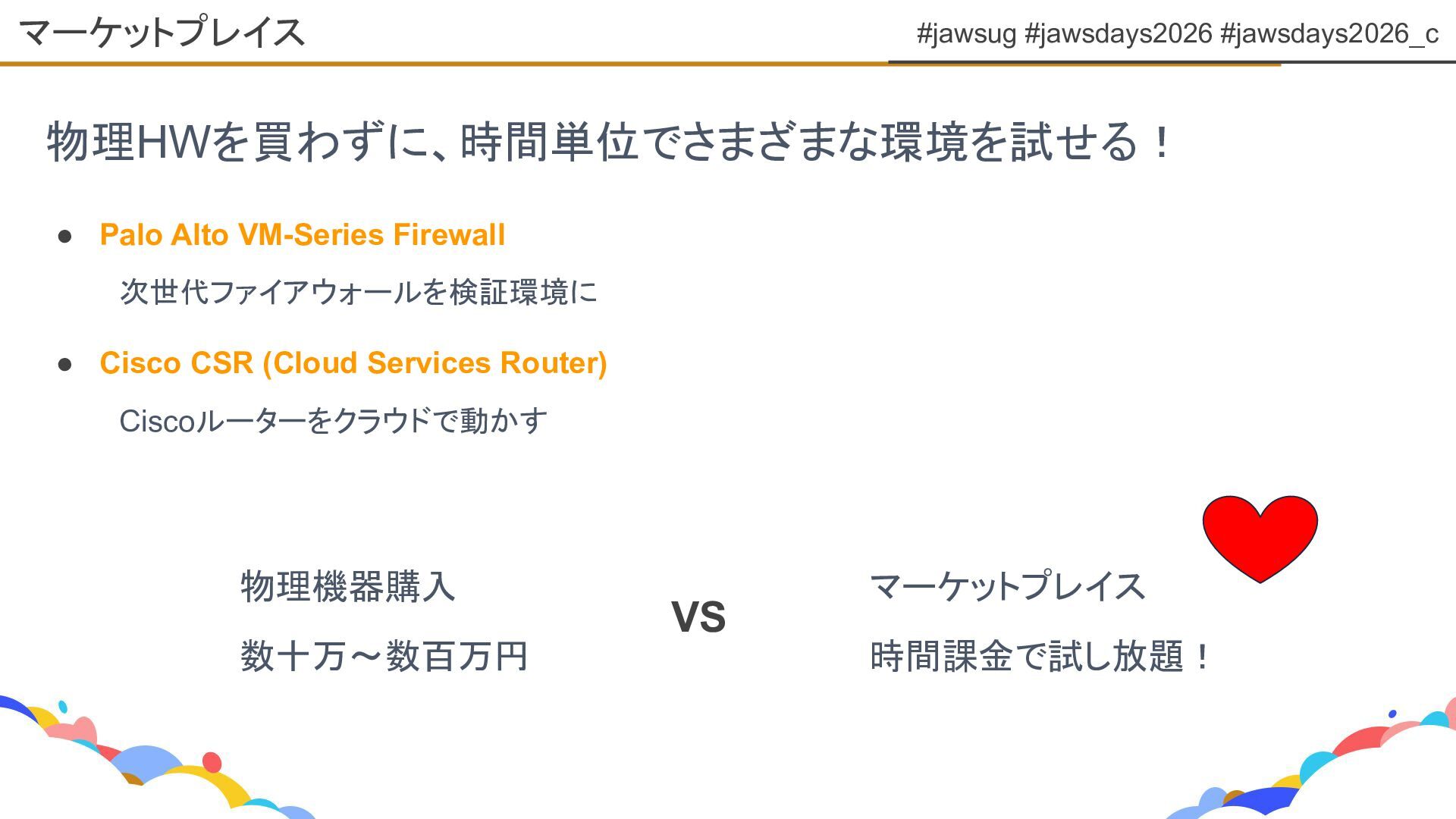 Cisco CSR (Cloud Services Router) Ciscoルーターをクラウドで動かす 物理HWを買わずに、時間単位でさまざまな環境を試せる! マーケットプレイス 物理機器購入 数十万〜数百万円 マーケットプレイス 時間課金で試し放題! VS