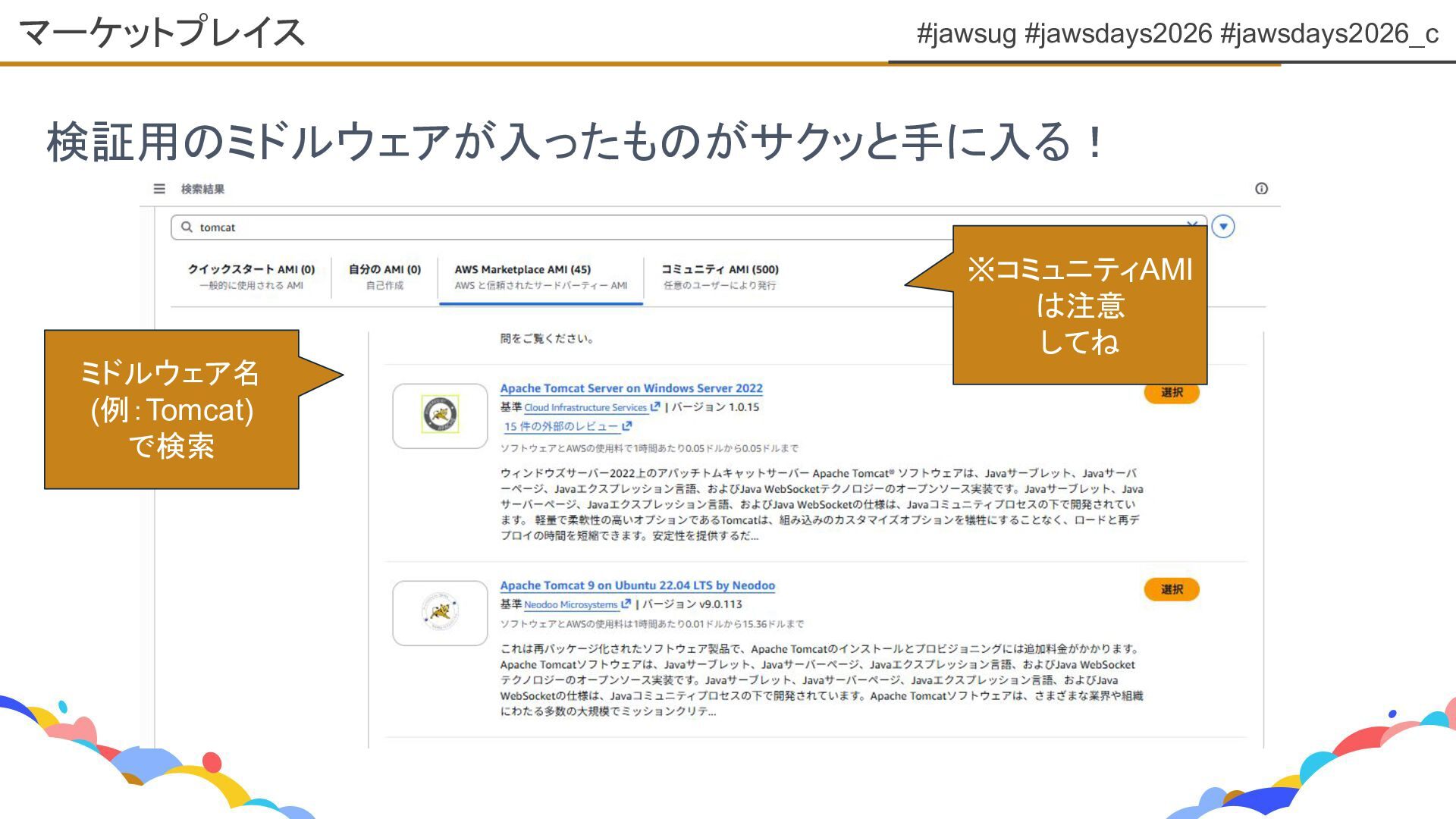 #jawsug #jawsdays2026 #jawsdays2026_c 検証用のミドルウェアが入ったものがサクッと手に入る! マーケットプレイス ミドルウェア名 (例:Tomcat) で検索 ※コミュニティAMI は注意