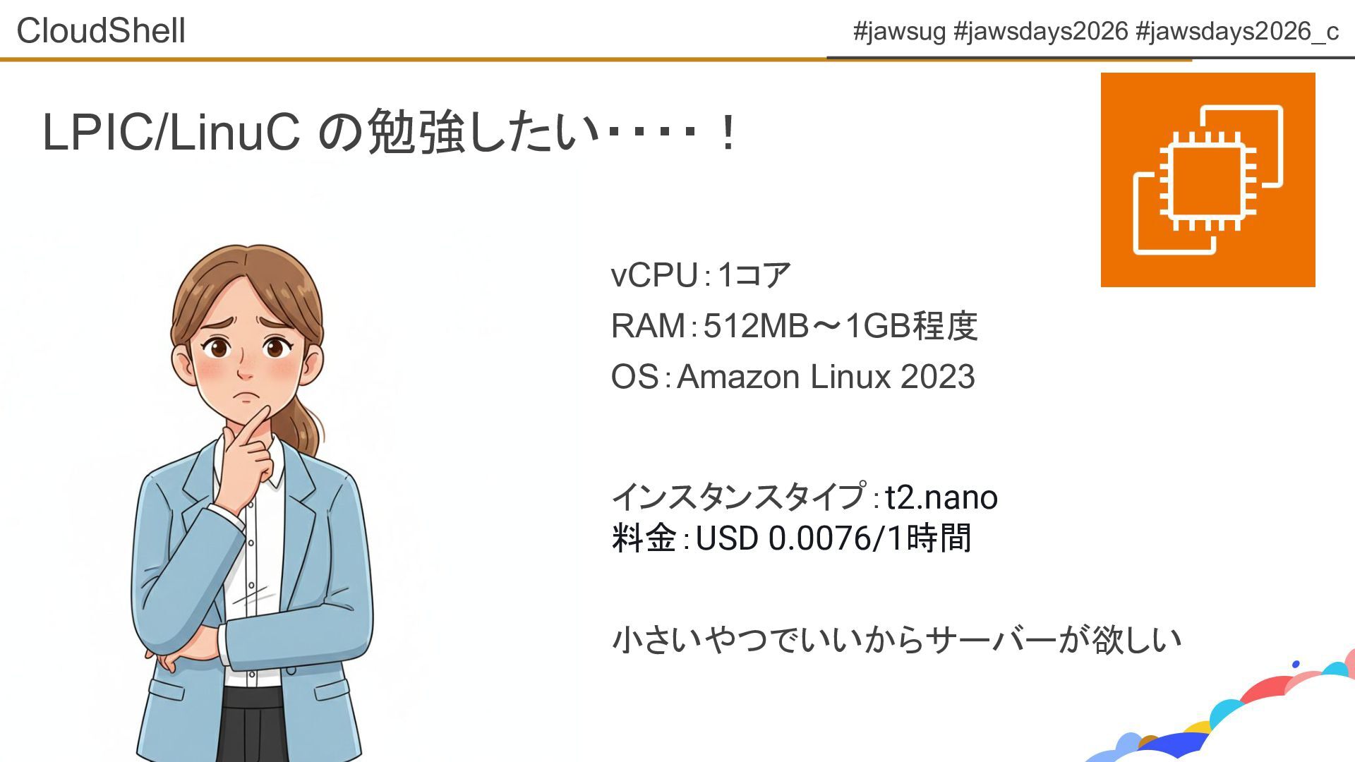 #jawsug #jawsdays2026 #jawsdays2026_c vCPU:1コア RAM:512MB〜1GB程度 OS:Amazon Linux 2023 インスタンスタイプ:t2.nano 料金:USD